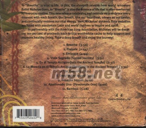 擁有健康的生命并不是理所當然的事.著名多才樂手NICHOLAS GUNN有感而發,利用長笛\敲擊\鋼琴等多樣樂哭將有活力的韻律注入拉丁樂,以[呼吸]為題帶出生命的可貴,喻音人們抱緊呼吸的每一刻.更將此碟一成收益捐贈美國肺臟協會,這是令人振奮的發燒音樂.