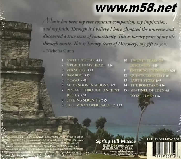 精彩二十年 TWENTY YEARS OF DISCAVERY 新世紀純音樂(m58.net) THE NATIONAL PARKS SERIES 美國國家公園系列專輯 美國國家公園專輯之二長笛手NICHOAS GUNN吹口音樂加上電子合成器、敲擊樂營造出原樂的氣氛及爽朗的節奏。GUNN有時亦會加插一些無詞的哼唱,自然的水聲鳥獸叫聲;簡直就是美國名勝大峽谷的現場混音版。