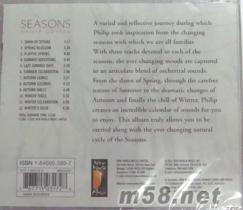季節(jié)(m58.net) 季節(jié) 集作曲,錄音及制作的全能音樂人I'hilip Guyler ,為表達(dá)對一年四季的不同感覺,就以不同的樂器加插人聲和收子音效混合而輯成,讓心靈感覺到高低起伏四季不同的氣候變化所帶來的感覺,放松,舒暢,和諧,正好形容這碟給我的感覺!