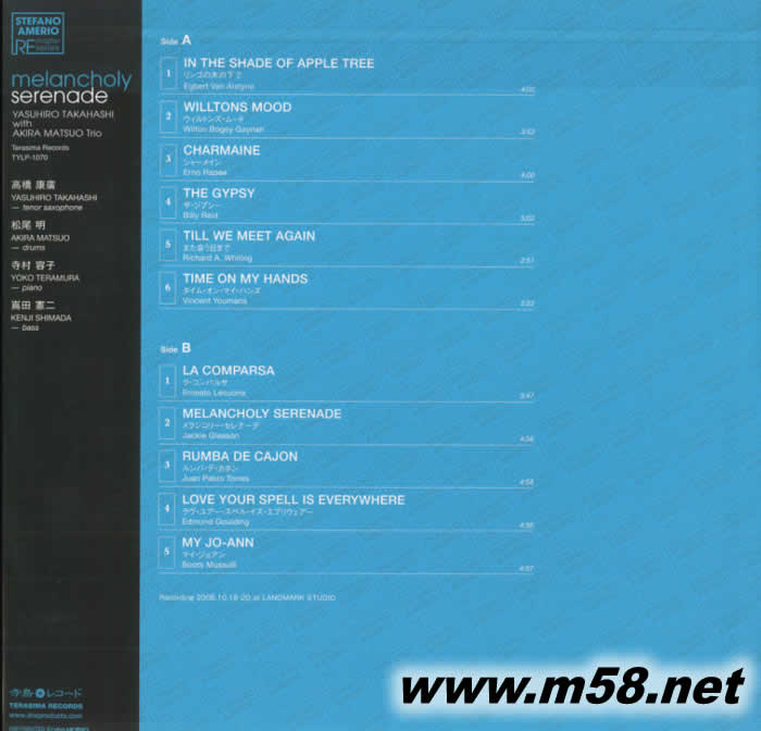 A1.In The Shade Of Apple Tree A2.Willtons Mood A3.Charmain A4.The Gypsy A5.Till We Meet Again A6.Time On My Hands B1. La Comparsa B2. Melancholy Serenade B3. Rumba Del Cajon B4.Love Your Spell Is Everywhere B5. My Jo-Ann 在蘋果樹的樹蔭下 A2.威爾頓情緒 A3.查曼 吉普賽人 直到我們再次見面 時間到了 B1。拉康帕薩 B2。憂郁小夜曲 B3。倫巴德爾卡戎 愛你的咒語無處不在 B5。我的喬·安
