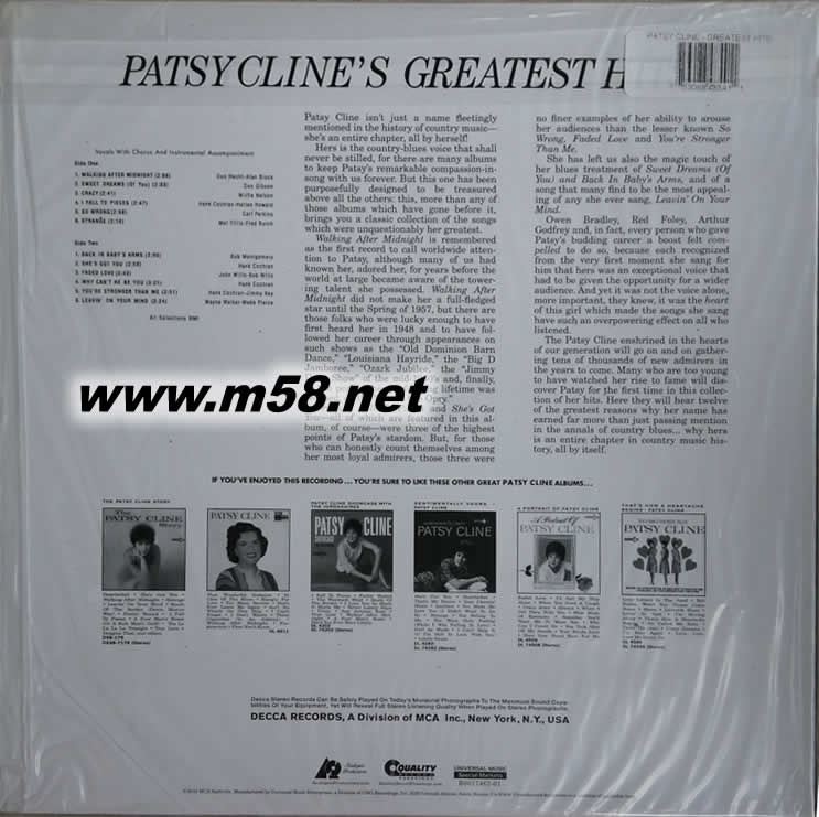 Side One: 1. Walking After Midnight 2. Sweet Dreams (Of You) 3. Crazy 4. I Fall To Pieces 5. So Wrong 6. Strange Side Two: 1. Back In Baby’s Arms 2. She’s Got You 3. Faded Love 4. Why Can’t He Be You 5. You’re Stronger Than Me 6. Leavin’ On Your Mind