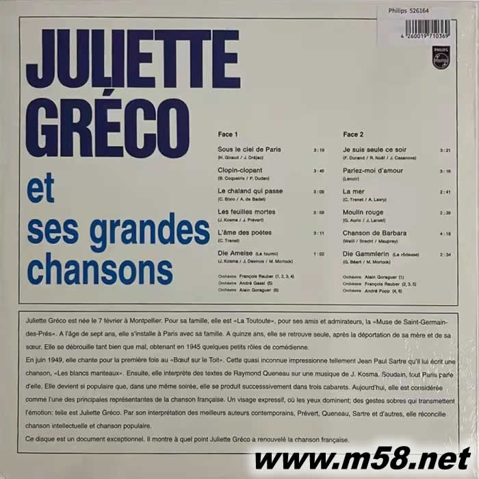 法國(guó)女歌手 JULIETTE GRECO ET SES GRANDES CHANSONS 黑膠專(zhuān)輯背面圖片