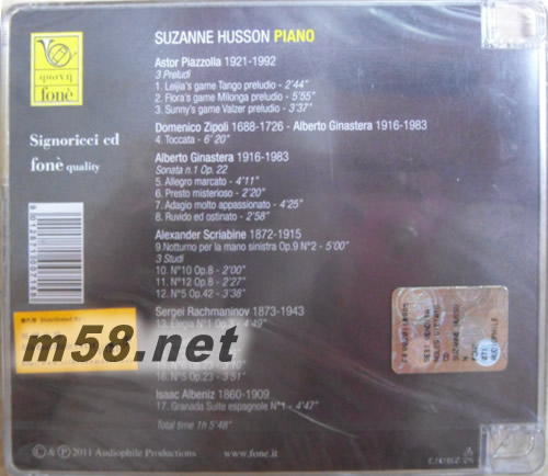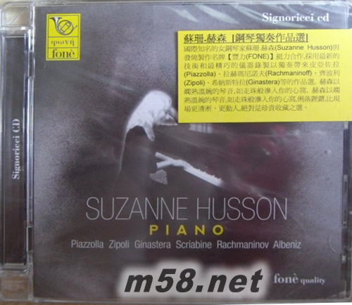 價格為估,以實到貨為準! 蘇珊 赫森鋼琴作品 Suzanne Husson Piano(m58.net) 蘇珊.赫森(Suzanne Husson)出生于阿根庭之布宜諾斯艾里斯(Buenos Aires)之法裔后代,她音樂天份極高,加上父母悉心的哉培,五歲開始在曼努埃爾.德.法利亞音樂學院(Conservatory "Manuel de Falla")跟隨德拉科(Elisabeth Wsterkamp de Raco)學習鋼琴,八歲便舉行首音樂會,隨后便轉赴瑞士,專心鑽研米凱蘭杰利(Arturo Benedetti Michelangeli)、希治布蘭德(Louis Hiltbrand)及塞德霍費(Bruno Seidhofer)的演奏技巧及風格,使其功力大進,更趨成熟,因而獲得多項國際音樂獎項包括"阿根庭莫扎特比賽"(Argentinian Mozarteum)第一名。赫森現時經常穿梭于歐洲、北美和拉丁美洲作公開演奏,獲得好評如潮,其演奏的曲目廣泛,包括經典古樂和現代作品,憑其出色的表現,受到樂迷的愛戴。她曾為數間國際知名的唱片公司錄音,成績蜚然。近期她得到著名錄音師里玆(Giulio Cesare Ricci)的邀請,特別與發燒製作名牌【豐力】挺力合作,採用最新的技術和最精巧的儀器錄製由赫森情深地演繹皮亞佐拉:前奏曲3首【Astor Piazzolla: 3 Preludes】,齊波利:托卡塔【Domenico Zipoli: Toccata】,希納斯特拉:第1奏鳴曲,作品22【Alberto Ginastera: Sonata no.1, Op.22】,斯克里亞賓:第2夜曲,作品9、第10練習曲,作品8、第12練習曲,作品8及第5練習曲,作品42【Alexander N. Scriabin: Nocturno Op.9 no.2, Etude no.10 Op.8, Etude no.12 Op.8 & Etude no.5 Op.42】, 拉赫瑪尼諾夫:第1悲歌,作品3、第2前奏曲,作品3、第6前奏曲,作品23及G小調第5前奏曲,作品23【Sergei Rachmaninov: Elegie no.1 Op.3, Prelude no.2 Op.3, Prelude no. 6 Op.23 and Prelude no.5 in G minor Op.23】與及阿爾貝尼斯:西班牙組曲-第1格拉納達-小夜曲【Issaac Albeniz: Suite Espagnole- Granada no.1-Serenata】等,赫森以嫻熟溫婉的琴音,如走珠般滲入你的心窩,俐落鏗鏘,比現場更清淅、更動人,絕對是珍貴收藏之選。