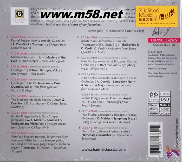 留聲機推介 經典頻道 三年紀念專輯 SACD(m58.net) . 於1990年由著名錄音工程司亞雷德.薩克斯(Jared Sacks)在荷蘭荷溫津(Herwijnen)成立的著名古典音樂製作公司「經典頻道(Channel Classics)」不經不覺已經三十年,在此悠長歲月當中薩克斯以驚人的毅力,對宣傳和推廣古典音樂不遺余力,充滿熱情,加上擁有顯赫的錄音技術,期間曾製作出多個令人回味無窮的經典專輯,獲得多個國際重要音樂奬項,更在2015年獲得權威音樂雜誌「留聲機(Gramophone)」頒授至高榮譽的「年度最佳品牌(Label of the Year)」,可謂實至名歸。 2. 薩克斯曾與多個國際知名樂團、樂隊、指揮、演奏家和聲樂家製作錄音專輯,協助和營造更多機會予他們增加演出經驗和提升他們的表演水平,這包括被「留聲機」音樂雜誌推許為世界十大樂團之一,由指揮大師 伊凡.費沙爾(Ivan Fischer)領導的布達佩斯節日樂團(Budapest Festival Orchestra)、「"留聲機"2018年度藝術家(Gramophone Artist of the Year 2018)」大獎的蕾切爾.普捷(Rachel Podger)、年青小提琴家寧峰和羅珊.菲力彭絲(Rosanne Philippens)、鋼琴家保羅.詹高馬蒂(Paolo Giacometti)和烏克蘭新星安娜.費多羅娃(Anna Fedorova)、大提琴天王彼得.威斯帕維(Pieter Wispelwey)和新彗星里克.史托蒂恩(Rick Stotijn)、阿姆斯特丹小交響樂團(Amsterdam Sinfonietta)和“荷蘭巴哈合唱及管弦樂團(The Netheralnds Bach Society)等,可謂是星光熠熠,令人注目。 3. 為慶祝公司成立三十週年紀念,「經典頻道」在已出版了的四百三十五個錄音專輯中精挑細選了十三首公司旗下最備受器重而又獲樂迷愛戴包括上述的演奏家和樂團的代表作,而這些作品亦曾被「留聲機」音樂雜誌的編輯作重點推介的樂曲或其精華片段合輯成極具可聽性的美樂集以回饋樂迷,精彩絕倫。 4. 被挑選的樂曲屬不同音樂類型,內容豐富充實,每首曲目均各具特色,絕對能滿足古典音樂及「發燒」樂迷的慾望。加上以SACD為載體,音色更為清晰明亮,冶人喜愛。