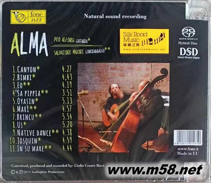 靈魂(Alma) 爵士二重奏大提琴與吉它 SACD(m58.net) Salvatore Maiore (低音大提琴) Peo Alfonsi (結他) 意大利爵士及古典結他手比奧.阿方斯(Peo Alfonsi)曾出過多張唱片,因他出色的結他技藝被融合爵士樂(fusion jazz)巨匠迪.美奧勒(Al Di Meola)垂青,被應邀在美奧勒的「新交響項目」(New Sinfonia Project)伴奏。阿方斯與合作無間的意大利低音大提琴家邁爾奧里(Salvatore Maiore)經常以音樂互相切磋,一起研究及創作,每次公開演出都沒有令樂迷失望,兩位於臺上使出音樂魔法,除了豐富的音樂經驗,他倆相融的默契,完美的演奏技巧也是讓人著迷的。由以製作頂級錄音而馳名國際的「豐力(fone)」其著名錄音師里茲(Giulio Cesare Ricci)採用經由錄音界奇才大衛.曼尼(David Manley)修訂之模擬錄音系統(analogue recording)包括採用Ampex ATR102兩軌盤式錄音座以1/2吋開盤磁帶,76/cm/sec轉速載原音源製作純模擬母盤, 於2015年4月的現場實況錄音, 分別配以SACD及全球限量 496套極之珍貴的33 1/3轉,180克,以處女膠單一階段式壓片(one-stage pressing)的黑膠盤為載體推出,帶來阿方斯及邁爾奧里的自創樂曲,包括: