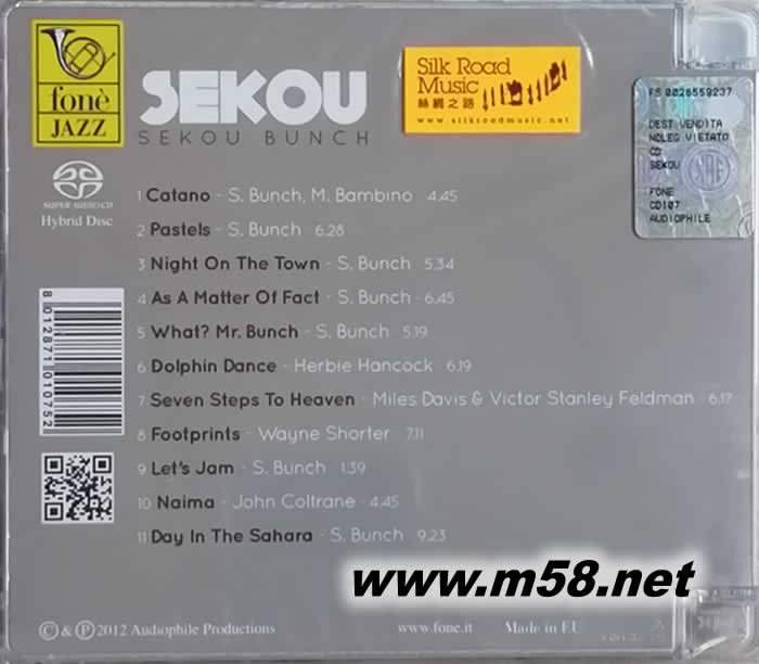 塞庫 本馳 塞庫 Sekou Bunch Sekou (爵士藝術家) SACD(m58.net) Sekou Bunch (低音結他) & Various 國際知名的爵士音樂家(Sekou Bunch)出生及成長於美國紐約,是一位多才多藝的藝術家,他擁有橫溢的音樂天份,能演奏多種樂器包括低音結他、低音大提琴、長笛、結他和鋼琴等但同樣地出色,同時,他亦是出色的畫家和舞蹈家,他在7歲時所繪畫的一幅畫現時被收藏在紐約美術博物館(Museum of Art, New York)。本馳精於多種音樂類別,亦能演奏多種樂器,加上他卓越的音樂才華融合於他的作品之中,使他成為一位廣受歡迎的作曲家及演奏家,他亦被邀請與多位天皇巨星合作,成為樂壇炙手可熱的重量級人物。本馳最近與發燒皇牌<豐力(Fone)>的合作,製作專輯【塞庫(Seikou)】,他所挑選的歌曲除了他自己的至愛作品包括【Catano(卡塔諾)】、【Pastels(粉彩)】、【Night On The Town(小鎮的晚上)】、【As A Matter Of Fact(事實如此)】、【What? Mr. Bunch(甚么?本馳先生)】、【Let’s Jam(讓我們一起夾歌)】及【Day In The Sahara(撒哈拉的一天)】,同時亦精挑了數位爵士樂巨擘的名作包括赫比•漢考克(Herbie Hancock)的【Dolphin Dance(海豚之舞)】,邁爾斯•戴維斯及維克多•士丹利•費德爾曼(Miles Davis & Victor Stanley Feldman)的【Seven Steps to Heaven(七步達天空)】,韋恩.肖蒂(Wayne Shorter)的【Footprints(足印)】和約翰.柯川(John Coltrane)的【Naima(奈馬)】等,這些歌曲都充份顯現本馳出眾的藝術天份和音樂才華,加上國際知名的錄音師里茲(Giulio Cesare Ricci)親自監製,並採用最極級的器材灌錄, 配以SACD為載體,空間感十足,定位清晰,使你如置身現場,是鑑聽必然之選。