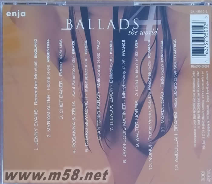 發燒情歌試音碟(四)(m58.net) 德國頂級發燒品牌ENJA輯錄旗下多首超靚聲浪漫情歌作品,我位名師分別演繹,由女歌星Jenny Evans的美聲展開了這個靚聲之旅.通透難解絕倫的音色突顯出人聲,吉它及鋼琴的無敵產體感,是人手一張的試機首選.