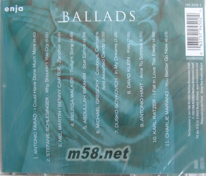發(fā)燒情歌試音碟(三)(m58.net) 德國頂級發(fā)燒器重Enja爵士情歌精選,由多位名家分另演繹,由感性的鋼琴開始,誘人的女歌聲,昔士風(fēng)大師演繹爵士情歌經(jīng)典,一連串透靚絕的音色,清晰定位等是試機的第一選擇.
