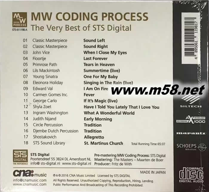 MW CODING PROCESS THE VERY BEST OF STS DIGITAL 馬蘭士2009最好精選集(m58.net) THE VERY BEST OF STS DIGITAL “超級(jí)精選” 荷蘭發(fā)燒品牌STS DIGITAL成立於1972年,公司由四個(gè)不同部門組成,分別是STS TELEVISION PRODUCTION、STS VIDEO PRODUCTION、STS PROJECTS及STS DIGITAL。尤以STS DIGITAL最為人所熟悉,它代表著發(fā)燒天碟錄音,錄音和后期製作技術(shù)更是業(yè)界先驅(qū)。打從STS DIGITAL推出MWCODINGPROCESS?首張作品后,發(fā)燒友均讚不絕口、全力追捧和收藏。今個(gè)夏季,STS DIGITAL挑選18首出色作品,發(fā)表首張MWCODINGPROCESS?編碼“超級(jí)精選”。受惠於這編碼,人聲比原作品更溫暖豐厚,像似黑膠唱片聲音,動(dòng)態(tài)更不可思議地寬闊,音樂(lè)細(xì)致之處更勝?gòu)那?。荷蘭直送,德國(guó)SONOPRESS印碟。不措工本,全球限量首批2000張,以人手製作凸字熨銀封套連獨(dú)一無(wú)二編號(hào),絕對(duì)值得收藏。鑒往知來(lái)MWCODINGPROCESS?定是明天製作指標(biāo)。