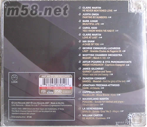 蓮 LINN RECORDS THE SUPER AUDIO SURROUND COLLECTION VOL 3 環(huán)繞王3 SACD(m58.net) 《蓮:SACD精選-3》(Linn: Super Audio Surround Collection Vol. 3)是蓮(Linn)最高品質(zhì)錄音的示范專輯,從爵士到古典,25年來的錄音精華。 從第一曲《He Never Mentioned Love》中鋼琴清晰的觸鍵、踏板聲,音響迷們就能發(fā)現(xiàn)Linn的爵士樂除了內(nèi)容之外,還有著絕佳的制作與錄音品質(zhì);雙鋼琴的林姆斯基-高沙可夫《西班牙隨想曲》里面兩臺鋼琴制造出的豐富、震撼的音響效果更是無比驚人;再聽聽第十二軌費里曼-阿特伍德的小號演奏,充滿光輝的小號聲破空而出,描繪出精彩的空間感;第十三軌的無伴奏合唱中各個聲部的位置分布精確無比,音響迷們仿佛可以數(shù)出合唱者的數(shù)目。 成立于1983年的Linn唱片公司是音樂界的先驅者之一,20多年來出版專輯超過300張,Linn對自己的唱片品質(zhì)控制少有公司能與之相比。雖然每張專輯是由不同的制作人與錄音師負責,但是最終的錄制品質(zhì)一定要能夠符合Linn自己的高標準。 Linn所專精的音樂領域包括古典、爵士與居爾特音樂等等,在爵士樂方面,Linn可說是英國最成功的獨立制片唱片公司之一。包括Claire Martin、Barb Jungr、Carol Kidd等歌手在英國都有著極高的地位,近年又加入Ian Shaw、Judith Owen等已經(jīng)在歌壇有佳績的歌手;另外,吉他手Martin Taylor也一直是英國最佳吉他演奏者之一。在古典音樂方面,杜丁合奏團的《Messiah》被英國許多媒體喻為這經(jīng)典曲目的最佳版本。他們的SACD有多張入選美國發(fā)燒天書《The Absolute Sound》創(chuàng)辦人Harry Pearson的超級SACD榜單。