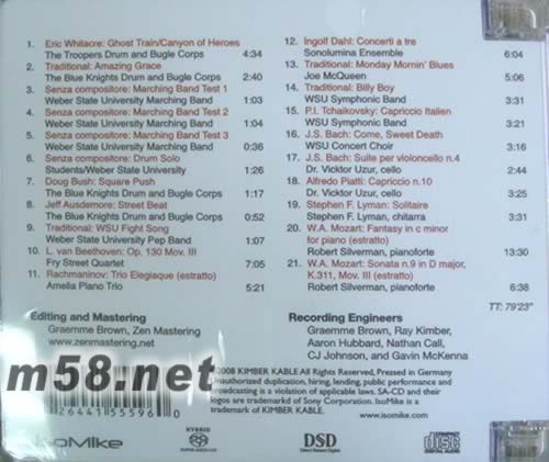 1.Eric Whitacre: Ghost Train - Canyon of Heroes -The Troopers Drum and Bugle Corps 2.Traditional: Amazing Grace - The Blue Knights Drum and Bugle Corps 3.Senza compositore: Marching Band Test 1 - Weber State University Marching Band 4.Senza compositore: Marching Band Test 2 - Weber State University Marching Band 5.Senza compositore: Marching Band Test 3 - Weber State University Marching Band 6.Senza compositore: Drum Solo - Students/ Weber State University 7.Doug Bush: Square Push - The Blue Knights Drum and Bugle Corps 8.Jeff Ausdemore: Street Beat - The Blue Knights Drum and Bugle Corps 9.Traditional: WSU Fight Song - Weber State University Pep Band 10. L. van Beethoven: Op. 130 Mov. Ill - Fry Street Quartet 11.Rachmaninov: Trio Elegiaque (estratto) - Amelia Piano Trio 12.Ingolf Dahl: Concert! A tre - Sonolumina Ensemble 13.Traditional: Monday Mornin' Blues - Joe McQueen 14.Traditional: Billy Boy - WSU Symphonic Band 15.P.I. Tchaikovsky: Capriccio Italien - WSU Symphonic Band 16.J.S. Bach: Come, Sweet Death - WSU Concert Choir 17.J.S. Bach: Suite per violoncello n.4 - Dr. Vicktor Uzur, cello 18.Alfredo Piatti: Capriccio n. 10 - Dr. Vicktor Uzur, cello 19.Stephen F. Lyman: Solitaire - Stephen F. Lyman, chitarra 20.W.A. Mozart: Fantasy in c minor for piano (estratto) - Robert Silverman, pianoforte 21.W.A. Mozart: Sonata n.9 in D major, K.311, Mov. Ill (estratto) - Robert Silverman, pianoforte