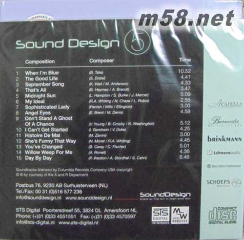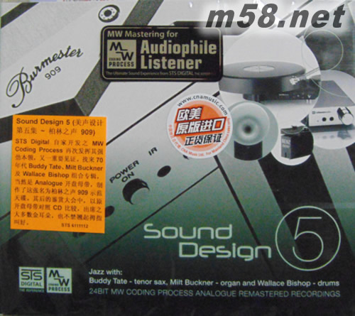 Sound Design 5 柏林之聲 909 美聲設計第五集(m58.net) STS Digital自家開發之MW Coding Process再次發揮其強勁本領,又一重要見證。荷蘭Sound Design (美聲設計公司) 與STS Digital第五度合作,找來60至70年代由Buddy Tate、Milt Buckner及Wallace Bishop組合錄音專集,當然是Analogue開盤母帶,製作了這張名為柏林之聲909示范天碟。荷蘭美聲設計公司特地借出全新Acapella La Musica Reference XLR cables,這對價值不菲之線材,潤滑整個製作過程,由開盤母帶到CD出品中,都有所得益。其后的鑑賞大會中,以原開盤母帶對照CD比較,出席之大多數金耳朵,也不禁翹起拇指叫好。 封面是德國著名的昂貴音響硬件製造商Burmester的909,由荷蘭發燒碟名宿STS Digital主理人Fritz de With親自以獨家研發的MW Coding處理炮製。音樂內容是美國哥倫比亞唱片公司提供的70年代美國爵士樂經典錄音,合共15首總播放時間超過70分鐘, Fritz de Withh以studer A80作播放音源,並接駁到 Burmester 948、Brinkmann、Acapella及馬蘭士,等多種高級器材與周遽線材混合配搭,以Weiss 24比特來處理製作,令到這批來自70年代的著名爵士樂錄音,呈現出鮮活傳真的音樂面貌。各種樂聲的質感上乘傳神,現場一樣的空氣感令任何聆聽者彷彿置身於爵士俱樂部。全身體感濃郁的臨場爵士樂演奏,震攝感人!