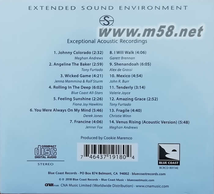 01. Meghan Andrews - Johnny Colorado 02. Tony Furtado - Angeline The Baker 03. Jenna Mammina & Rolf Sturm - Wicked Game 04. Blue Coast All-Stars - Rolling In The Deep 05. Fiona Joy Hawkins - Feeling Sunshine 06. Derek Jones - You Were Always On My Mind 07. Jenner Fox – Francine 08. Garett Brennan - I Will Walk 09. Alex de Grassi - Shenandoah 10. John R. Burr - Mexico 11. Valerie Joyce - Tenderly 12. Tony Furtado - Amazing Grace 13. Christie Winn – Fragile 14. Meghan Andrews – Venus Rising (Acoustic Version)
