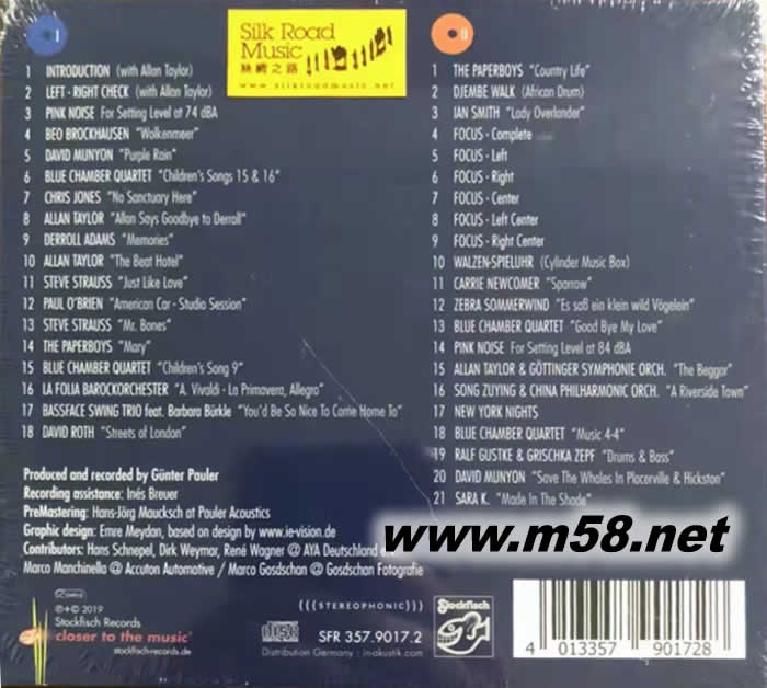 1. Introduction (with Allan Taylor) 亞倫.泰勒:引言 2. Left - Right Check (with Allan Taylor) 左右聲道檢測 3. Pink Noise For Setting Level At 74 dBA 粉紅噪音74 dBA 4. Beo Brockhausen: Wolkenmeer 云海 5. David Munyon: Purple Rain 紫雨 6. Blue Chamber Quartet: Children’s Songs 15 & 16 兒童歌曲15 & 16 7. Chris Jones: No Sanctuary Here 這里沒有避難所 8. Allan Taylor: Allan Says Goodbye To Derroll 亞倫.泰勒向達瑞爾.亞當斯道別 9. Derroll Adams: Memories 回憶 10. Allan Taylor: The Beat Hotel 夢想的旅店 11. Steve Strauss: Just Like Love 這就是愛 12. Paul O’Brien: American Car - Studio Session 美國車 13. Steve Strauss: Mr. Bones 骨頭先生 14. The Paperboys: Mary 瑪莉 15. Blue Chamber Quartet: Children’s Song 9 兒童歌曲9 16. La Folia Barockorchester: A. Vivaldi - La Primavera, Allegro 韋瓦第:四季-春 17. Bassface Swing Trio Feat. Barbara Bürkle: You’d Be So Nice To Come Home To 你回來了真好 18. David Roth: Streets Of London 倫敦街道