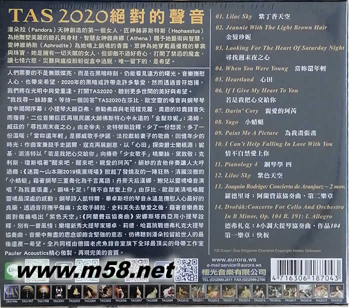 TAS 絕對的聲音CD 2020(m58.net) 潘朵拉(Pandora) 天神創造的第一個女人,匠神赫菲斯特斯(Hephaestus)為她雕塑美麗的臉孔與身材,智慧女神雅典娜(Athena)賜予她藝術與智慧,愛神維納斯(Aphrodite)為她噴上銷魂的香露,眾神為她穿戴最優雅的華裳與珠寶,她是擁有一切天賦的女人,但卻敵不過好奇心,打開了禁忌的魔盒,讓七情六慾,災難與瘟疫紛紛從盒中逃脫,唯一留下的,是希望。 人們需要的不是無限燦亮,而是在黑暗時刻,仍能看見遠方的曙光。音樂撫慰人心,也帶來希望,2020年的黑暗或許帶走許多摯愛,然而透過音符悠揚,我們將在光明中與愛重逢。打開TAS2020,聽到更多世間的美好與希望。 “我找尋一絲跡象,等待一個回答”TAS2020在莎比.歐空靈的嗓音與鋼琴琴音中揭開序幕;小提琴大師亞弗.泰勒弗森與老搭檔克羅.奧恩的珍貴錄音失而復得,二位音樂巨匠再現民謠大師佛斯特心中永遠的「金髮珍妮」;湯姆.威茲的「尋找周末夜之心」由史帝夫.史特勞斯詮釋,少了一份愁苦,多了一份溫暖;「當妳還年輕」是挪威歌手伊諾.法拉獻給妻子的歌曲,回憶年少的時光;作曲家兼鼓手史諾爾.寇克再展創意,以「心田」探索爵士樂根源;妮基.派洛特以「若是我把心交給你」向傳奇「少女歌手」桃樂絲.黛致敬;克利斯.瓊斯唱著“醒來吧,醒來吧,親愛的珂芮”,絕妙的吉他伴奏讓人大呼過癮;《迷霧~山本剛2019橫濱現場》掀起了發燒友的一陣狂熱,清麗淡雅的「小蜻蜓」藉著鋼琴三重奏化為千言萬語;丹麥天后漢娜.鮑兒以靈魂嗓音演唱「為我畫張畫」,韻味十足;「情不自禁愛上你」由莎比.歐甜美清唱喚醒靈魂最深處的感動;鋼琴詩人凱特爾.畢卓斯坦的琴音永遠是撫慰人心最好的良藥,透過音符撫平傷痛;女歌手綺拉.史科芙失去摯愛之后,藉著音樂勇敢面對傷痛唱出「紫色天空」;《阿蘭費茲協奏曲》安娜斯塔西亞用小提琴詮釋,別有一番風情;樂壇新秀大提琴家珊卓.莉德.哈嘉挑戰德弗札克大提琴協奏曲,音樂中無盡的思念卻飽含堅強的意志,彷彿聽到潘朵拉留給世人的最后遺產-希望。全片同樣由德國老虎魚錄音室旗下全球最頂尖的母帶工作室Pauler Acoustics精心后製,再現完美的音質。