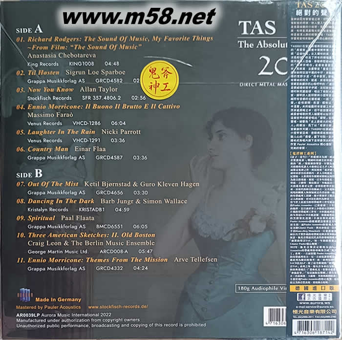 TAS 絕對的聲音LP 2021 黑膠 限量版(m58.net) 愛神邱比特掌管愛之箭,他拉緊弓弦,發射愛的奇跡,戀人墜入情網的瞬間,是他最快樂的小祕密。愛情的酸澀與甜美,有時是清晨陽光般的俏皮快板,有時是夜深人靜的輕聲歌唱,TAS2021為你重現愛情來臨時,怦然心動的時刻。 TAS2021在安娜斯塔西亞細膩且戲劇性的「真善美」演奏中揭開序幕。西格恩將「這個秋天」注入獨特的美,如秋日涼風輕吹,吹走了所有的煩惱憂愁。英國民謠詩人亞倫.泰勒將歷經40年考驗的「妳終於明白」呈獻給喜歡音樂的你。馬斯莫.法羅帶來「黃昏三鏢客」讓你如同狂放不羈的牛仔,身臨塵土飛揚的荒野沙漠。「雨中歡笑」即使是沒有帶傘的雨天,妮基.派洛特甜美的嗓音總是能讓你的心暖呼呼的。「避世者」是挪威環保歌手伊諾.法拉結合優美的鄉村和民謠旋律,唱出了他對大自然的愛。鋼琴詩人凱特爾與小提琴家古羅跨越所有音樂的主觀意識,一起「走出迷霧」。疫情期間,芭菠.楊格以「黑暗中漫舞」共同勉勵所有音樂工作者,雖然身處黑暗之中,但不能放棄希望。「阿拉貝克斯藍調」史諾爾.寇克四重奏與史蒂芬.萊利的結合活潑熱情,猶如一杯充滿靈魂和搖擺的雞尾酒。「最終」挪威葛萊美獎最佳女歌手綺拉帶領音樂家們在疫情期間,用音樂留下印記,像一棵強壯的大樹,緊緊的團結在一起。挪威最會唱歌的男人福羅塔以似乎不屬於這個世界的聲音唱出「靈歌」佔領你的靈魂。被譽為「史上最偉大的唱片製作人」的喬治.馬丁以「老波士頓」展現音樂創作天賦。亞弗.泰勒弗森與克羅.奧恩用「船歌」帶你進入浪漫的水都,貢多拉在蜿蜒水道間來往穿梭,如詩如畫。TAS2021在挪威國寶級小提琴家亞弗.泰勒弗森氣勢磅礡,撼動人心的「教會」畫下句點。全片由德國老虎魚唱片旗下全球最頂尖的母帶工作室 Pauler Acoustics 精心后製,再現完美的音質。