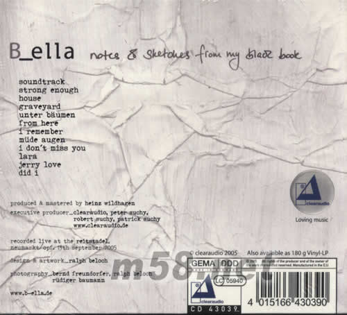 BELLA 筆記、素描來自于我的黑皮書NOTES SKETCHES FORM MY BLACK BOOK(m58.net) 德國制作人、錄音師:HEINZ WILDHAGEN 發燒音響 (1/6/2006) Author: 王惠? 完美 德國發燒品牌Clearaudio於2005年推出 Folk Music組合B-ella,首張集合女聲和結他的發燒極品《Tracks of Heart》推出后轟動音響界。全新歌集《Notes & Sketches form my Black Book》能否維持優勢反而受到樂迷關注。就以筆者聆聽碟內的多個曲目得知,Sabine Bickel 的女聲是依舊的清麗優美,甜美悅耳之腔音實在靚得罕有,筆者最愛二個曲目為《Mude Augen》和《Jerry Love》,前者所帶出的輕快節拍,與像沒有盡頭的音樂活力,聽得人非常雀躍;后者以樂器的鮮明度帶給聽者興奮,質量與低頻震撼之同時,襯托出 Sabine Bickel的嬌柔清通味靚絕人寰。要全面勝得過 《Notes & Sketches from my Black Book》,可能只有同期推出180gVinyl黑膠 LP? 發燒音響 (1/6/2006) Author: 阿明 臨場感強 這一款爵士樂錄音為歐陸出品,為德國超級發燒器材生產商Clearaudio的又一靚聲錄音,不論唱片、音樂風格和音效,都和前一張美國出品完全不同,但又不能硬說那一張更靚聲,只能交由發燒友自己去玩味。 這是一個現場錄音,而它的成功之處,在於能捕捉那份臨場感,音樂畫面清晰至極,空氣感強,女聲像破空而出,伴奏樂器則玲瓏浮凸地置於眼前,實不可思議。演唱方面,Bella的演繹成熱豪邁,不同於Erin那清新甜美的演出,伴奏樂器的力量則輕一點,沒有那美國式的厚重感,味道相當不同。 聽爵士樂,我們既要聽效果,也要講求感覺,這兩款CD正好展示了靚聲爵士錄音的兩種境界,最宜兼收並蓄。
