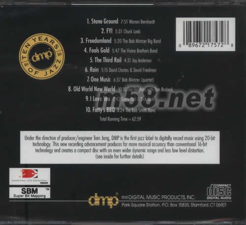 1.STONE GRUND WORREN BEMHARDT 2.FYL CHUCK LOED 3.FREEDOMLAND THE BOB MINZER BIG BOND 4.FOOLS GOLD THE VIVINO BROTHERS BOND 5.THE THIRD RAIL JOY ANDERSON 6.RAIN DAVID CHARLES DAVID FRIEDMON 7.ONE MUSIC BOB MINTZER(QUARTET) 8.OLD WORLD NEW WORLD THE DOLPHINS WITH DON BRUBECK 9.I LOVE YOU GARRY DIAL DICK OATTS 10.FATTY'S BBQ THE BOD SMITH BAND