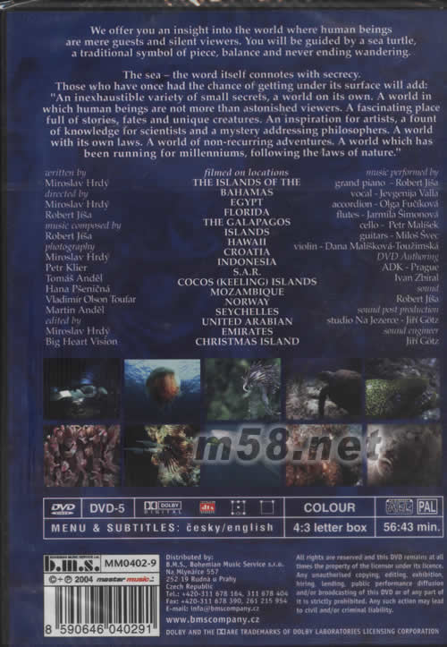 價格為估,以實到貨為準! COLOURS OF SEA 水彩畫DVD(m58.net) 水彩畫 本片在可可斯群島、莫三比克、塞昔爾、阿拉伯半島、巴哈克羅西亞、加拉巴多群挪威、圣誕島、佛羅里達海峽、夏威夷等地進行拍攝,這張極具誠意之作品,由捷克人制作,的確,影片的襯底音樂又很有捷克感覺,藍藍的…動與靜的配合,很新鮮;拍攝手法很細膩,故事味道濃,而音樂亦配合畫面的動態,像鯊魚群的出現時,便會奏出整隊軍隊般雄偉氣勢,配合DTS體系,盡顯度色的能耐。如果每年都有一張必買的DVD(水彩畫)便是你04年的選擇!