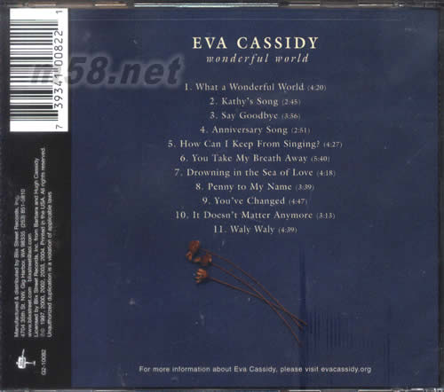 Wonderful World 奇妙世界(m58.net) 1996年11月,默默無名的Eva Cassidy因為皮膚癌退出人間, 當時人們只能在美國華盛頓特區的幾家民謠 爵士Club聽聞此號人物 當年她才33歲。 或許冥冥中的安排, 上天雖然趕著讓Eva早些升天當天使, 但Eva Cassidy動人的歌喉卻還是保存下來, 五年之后流傳全球。 每一個Eva唱出的音符,歌詞也好,輕吟也好, 都是深切感人, 我覺得這已經不是「天籟」可以形容, 因為Eva的歌聲是接近心底, 再加上Eva的吉他彈奏, 她的歌曲是毫無冷場的佳作無庸置疑。