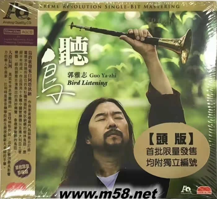 聽鳥 AQCD 頭版 AQCD(m58.net) 1998年榮獲美國紐約Pro Musicians國際大賽中唯一大獎!他使嗩吶大放異彩,是音樂會上光彩照人的明星 郭雅志的這張個人唱片,就是他超凡的藝術(shù)靈性與精湛的演奏技巧最淋漓盡致而且最令人歎為“聽”止的融合結(jié)晶,也是迄今為止世間唯一一張以嗩吶擔(dān)綱主奏的中樂發(fā)燒唱片。為了它,友人林錫堅(香港現(xiàn)代音像有限公司掌門人)精心策劃,友情延請名頭愈來愈大的美國獨立唱片廠牌M·A Recordings老闆兼錄音怪杰Todd Garfinkle攜他的獨門錄音名器專程來港操刀錄音。對教堂錄音情有獨鍾的Todd Garfinkle在林錫堅引領(lǐng)下走遍全港大小教堂,終于在位于西貢清水灣半山腰的百年名校——三育書院里覓到了景輝堂這個理想之地。景輝堂可容納350人聞道,堂音豐滿悅耳,殘響自然理想,既是錄音師又是鋼琴家的Todd Garfinkle巧手稍加擺弄,慧心妙用無窮,與郭雅志靈犀互通,才成就這一張空前靚聲的中樂吹管天碟
