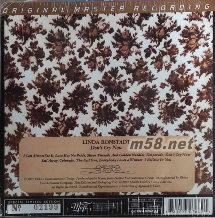 Don't Cry Now 24K GOLD(m58.net) 是美國70年代最受歡迎的女歌手,曾五次登上滾石雜志封面,十次獲得格萊美獎,足見她在美國流行歌壇上的地位。 《別哭泣》(Don't Cry Now)是琳達(dá)?朗絲黛(Linda Ronstadt)的第四張專輯,1973年推出,正值她的巔峰時期。此專輯是她的首張金唱片,其中的單曲《Silver Threads & Golden Needles》成功奪得格萊美獎。1974年琳達(dá)發(fā)行的《Heart Like A Wheel》,更使她身價爆漲,并且?guī)忧耙粡垖]嫛禗on’t Cry Now》銷售突破50萬張。