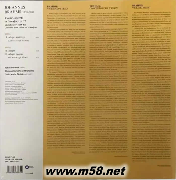布拉姆斯:D大調小提琴協奏曲,作品77 Brahms: Violin Concerto 黑膠(m58.net) 布拉姆斯一直將貝多芬視為偶像,他的小提琴協奏曲和貝多芬的一樣,採用D大調,雖然說,布拉姆斯在創作這首小提琴之前,曾經在游歷義大利的旅途上接受了文化與景色的啟發而產生靈感,過程中也受到提獻者,也就是當時的小提琴大師姚阿幸的協助,但這首小提琴協奏曲避開了華麗的炫技,而著重在深刻精神層面的內涵與恢宏的格局,與貝多芬的小提琴協奏曲在精神上相互呼應,則是這首小提琴協奏曲之所以偉大的重要原因。 這是1976年,帕爾曼與朱里尼指揮芝加哥交響樂團合作的布拉姆斯小提琴協奏曲。帕爾曼曾經兩度錄製這首名列音樂史上「四大小提琴協奏曲」之一的杰作,76年是錄音室作品,1992年他與巴倫波因指揮柏林愛樂合作的則是現場音樂會。帕爾曼曾經說過,對於每一次的錄音,他都非常慎重。每當決定灌錄某一首作品時,他會先在錄音室中先行錄下參考用的試聽帶,用來在正式錄音之前,修正演奏手法。帕爾曼對每一張錄音的品質也相當有信心,他曾說,如果不滿意,絕對不會發行。指揮家朱里尼在布拉姆斯音樂上鉆研之深厚,備受肯定,他與芝加哥交響樂團正統的古典風格,正好能夠給帕爾曼堅實有力的支持,於是整張錄音不僅僅只是一份小提琴家的個人表現機會,而是一份完整、有著交響曲架構的不朽經典。