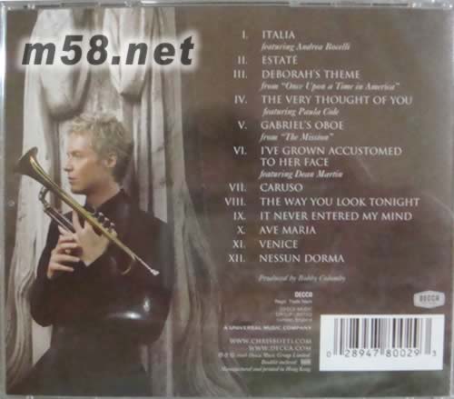 ITALIA(爵士小號(hào)手)(古典愛好者必備)(m58.net) Chris Botti,小號(hào)手,人年輕音樂資歷卻已十分豐富。十歲開始演奏,高中時(shí)開始職業(yè)生涯;生涯早期曾與薩克斯風(fēng)手George Coleman、小號(hào)手Woody Shaw等爵士樂傳奇人物合作。這些人的音樂常劍走偏鋒,Botti在這段期間的收獲反映在他演奏時(shí)不溫不火的聲調(diào)與天馬行空的創(chuàng)意。隨后Botti轉(zhuǎn)戰(zhàn)流行音樂圈。受過爵士樂的洗禮,Botti不甘生涯僅止于泡泡糖般的流行聲響,合作的對象均為“言之有 物”的流行樂壇大將;如巴布狄倫Bob Dylan、艾瑞莎法蘭克林Aretha Franklin、保羅賽門Paul Simon與史汀Sting等角色。從他曾合作過的對象,聽者即使還不認(rèn)識(shí)他,也應(yīng)可以從中建立起某種“信任”,因?yàn)镃hris Botti不像是會(huì)隨便玩音樂的泛泛之輩。他是史汀Sting、保羅賽門Paul Simon、巴布狄倫Bob Dylan偏愛指定樂手、繼Chet Baker后最令人期待的白人小喇叭手,這位兼具迷人外表以及優(yōu)異才華的Chris發(fā)行了個(gè)人第一張專輯"Night Session 午夜時(shí)刻后引起了樂壇的一陣討論。