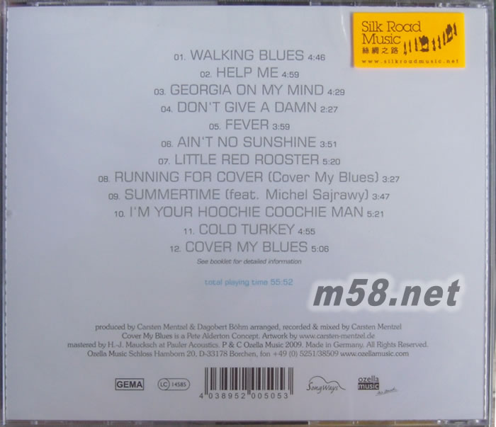 Cover My Blues覆蓋我的藍調(m58.net) 來自英國的彼特‧艾爾德頓藍調唱腔渾然天成,低沈而充滿磁性,粗獷卻不粗糙,不用刻意矯情,就能散發無比強烈的感染力,更重要的是,他有本事為經典藍調注入新生命。聽他翻唱早期草根藍調大師Robert Johnson的Walking Blues,濃郁的密西西比藍調原味頓時流泄,卻一點也沒有陳舊氣息。Help Me涌進的藍調音階,考驗著歌者的藍調唱功,別人需要刻意揣摩的藍調韻味,彼特彷彿隨口哼唱就能抓住神髓。Georgia On My Mind翻唱者不計其數,但是能像彼特這般唱得輕鬆坦然者卻不多。詮釋另一首經典Summertime,彼特換上輕快節拍,沒想到卻產生了不可思議的化學變化,為這首老歌增添時尚現代感。專輯同名創作曲Cover My Blues淡淡的感傷氛圍令人著迷。製作人兼吉他手Carsten Mentzel不落俗套的演奏是專輯另一個焦點,優異的錄音更令人驚艷。