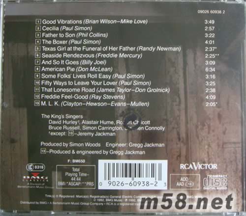 Good Vibrations(m58.net) 英國和聲六人組國王合唱團(tuán)(The King's Singers)堪稱合唱之王 。國王合唱團(tuán)是由六個(gè)男生組成的美聲團(tuán)體(高男高音-郝利、男中音-勞森、高男高音-泰森、男中音-克勞奇、男高音-菲尼斯、男低音-康納利),兩個(gè)高男高音有高音繞梁的本事,乍聽之下以為是女高音引喉飆竄;男低音則作鼓聲隆隆,引導(dǎo)音樂以各種節(jié)奏向前行進(jìn);六個(gè)聲部變化多端的組合排列,聽來宛如一個(gè)樂團(tuán)的大合奏。他們音色純凈和諧,聲部平衡,和聲精妙,節(jié)奏精準(zhǔn),演唱表情豐富,極具感染力。