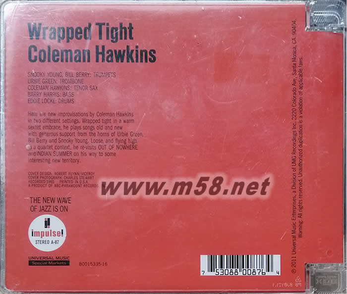 爵士薩克斯大師與老伙計們 Wrapped Tight 裹緊 SACD(m58.net) SOOOKY YOUNG\BILL BERRY: 小號 URBIE GREEN:長號 Coleman Hawkins:薩克斯 BARRY HARRIS:貝斯 EDDIE LOCKE:鼓 柯曼·霍金斯(Coleman Hawkins,1904-1969),美國演奏家,是爵士樂歷史上第一位重要的次中音薩克斯管演奏家,同時他也是有史以來最偉大的演奏家之一。他的演藝生涯持續(xù)了整整四十年(1925年至1965年),在此期間他的技藝堪與任何一位同行抗衡。 不僅以器樂音色圓潤飽滿著稱,招牌滑音更是優(yōu)美流暢,他總能於吹奏之際透過細(xì)膩迷情的柔性延展傳遞出最馥郁芳馨的搖擺興味,也因此除了擁有“次中音薩克斯風(fēng)之父”美稱