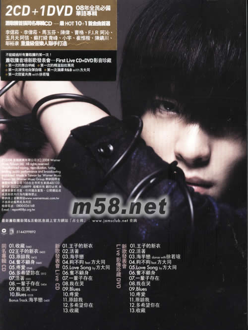 同名專輯(First Live 影音限定版)(m58.net) 這個人 天生下來就是要握著麥克風用生命唱歌 蕭敬騰 同名專輯-First Live影音限定版 2CD+1DVD ★08年全民必備華語專輯 蕭敬騰首張同名專輯CD—最HOT 10+1首金曲首選 李偲菘、李偉菘、馬玉芬、陳偉、曹格、F.I.R 阿沁、五月天 阿信、蘇打綠 青峰、小宇、崔惟楷、陳鎮川、鄔裕康重量級音樂人聯手打造 ★不能錯過所有蕭敬騰的第一次! 蕭敬騰首場新歌發表會LiveCD +蕭敬騰首場新歌發表會影音珍藏DVD -第一次的舞臺吶喊 -第一次的精湛鼓技 -第一次深情地自彈自唱 -第一次演繹R&B with方大同 -第一次甜蜜共舞 with徐若瑄
