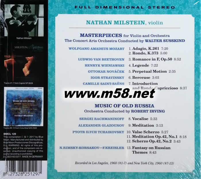 弦作 Masterpieces MUSIC OF OLD RUSSIA 俄羅斯古老的音樂 立體聲名盤(TAS專業推介發燒名盤)(m58.net) Nathan Milstein (Violin), Walter Susskind (Conductor), The Concert Arts Orchestra ,小提琴與管弦樂杰作選 / 米爾斯坦(小提琴)、蘇斯金(指揮)、演奏藝術管弦樂團 1960年密爾斯坦(Nathan Milstein)在美國錄下兩張高水準作品,分別是Masterpieces(弦作)及Music of Old Russia(俄羅斯老歌),樂迷一向都欣賞他剛猛有力道的拉奏,但這張Masterpieces一反常態,輕描淡寫,悠然自得的演出,難得一見!因此他挑選了貝多芬的《浪漫曲》,莫札特的《慢板》等等名曲,高水準的技巧,聽得輕鬆愜意。