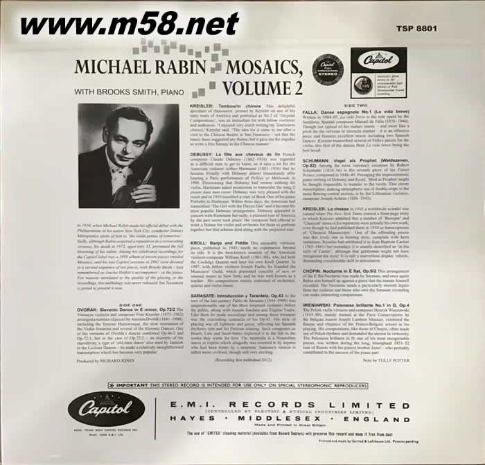 Mosaics The Magic Bow (拉賓最強(qiáng)小品集)馬賽克 180g 33RPM LP 黑膠(m58.net) 拉賓(Michael Rabin) 小提琴 / BROOKS SMITH 鋼琴 1961年錄音,立體聲傳世銘盤首度發(fā)行;黑膠樂迷 拼死以求之小提琴精品; Capitol原廠音源精心轉(zhuǎn)製 由”小提琴之神”海飛茲生前最佳鋼琴拍檔伴奏, 精彩演繹 斯拉夫舞曲/中國(guó)花鼓/西班牙之舞/夜曲/波蘭舞曲 ...10首雅致小品 Mosaic{ 拉賓最精華小品 1 / SP8506} 同步發(fā)行