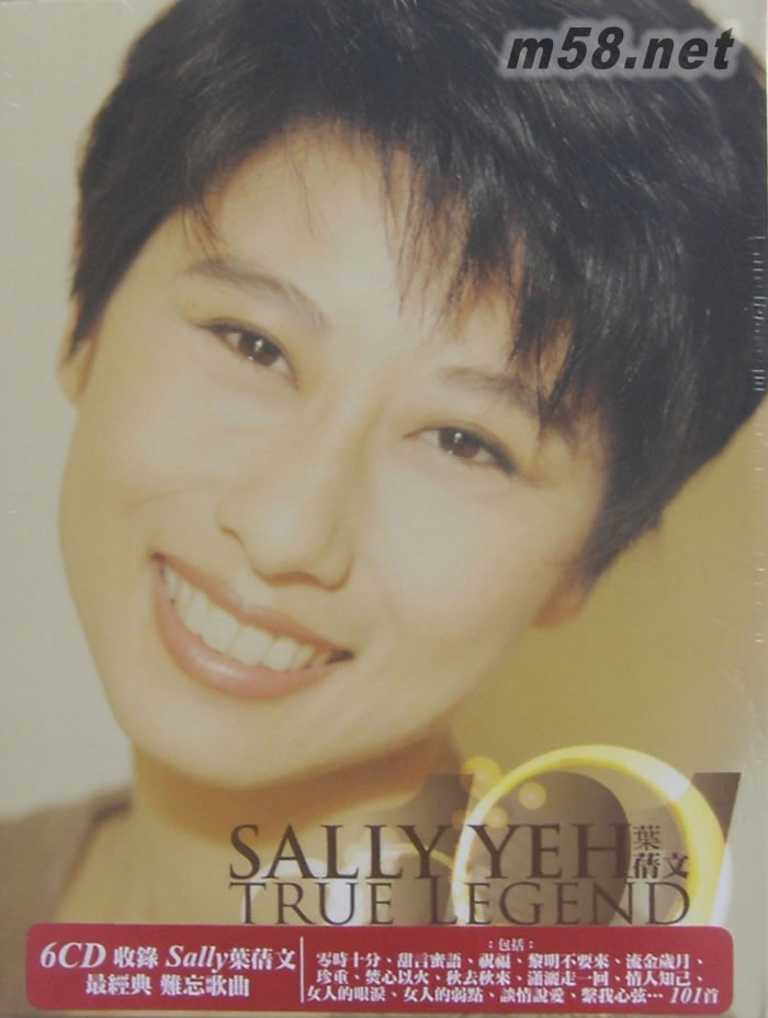 True Legend (6CD套裝)(m58.net) 葉蒨文 True Legend 6CD Sally葉蒨文于1984年華納推出首張粵語專輯,憑歌曲[零時十分] 走紅。于1990至1993年連續4屆奪得[十大勁歌金曲頒獎典禮] 的[最受歡迎女歌星獎] 。1993年臺灣第五屆[金曲獎] 的[最佳國語女演唱人獎] 。1995年憑[女人的弱點] 成1994年度十大勁歌金曲十大金曲獎。 奠定殿堂級天后地位。 6CD 收錄 101首葉蒨文最經典難忘歌曲 包括: 零時十分、Never Gonna Let You Go、長夜My Love Goodnight、愿死也為情、200度、Cha Cha Cha 我要活下去、 甜言蜜語、海旁獨唱、干一杯、美夢記心中、祝福、黎明不要來、流金歲月、面對面 最愛是我家、他、珍重、焚心以火、諾言、在夜里寂靜時、秋去秋來、難舍難分、仍是愛你一個 只因有愛、信自己、春風秋雨、憑千個心、關懷、不了情、瀟灑走一回、一輩子溫柔、紅塵 情人知已、曾經心痛(國語)、愛到分離仍是愛、女人的眼淚、原來愛過以后、與你又過一天 完全是你、真心真意過一生(國語)、選擇、歡笑之歌、女人的弱點、別人的情歌、等愛的心 與你傾訴、當一切別離我、其實你知、福氣、談情說愛、自強不息、男與女 蒨意、系我心弦、揚眉女子…101首。