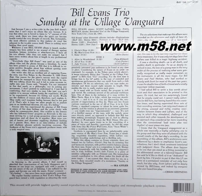 鋼琴詩人 Sunday At The Village Vanguard星期天的鄉(xiāng)村爵士鋼琴 黑膠(m58.net) 比爾.伊文思三重奏 LP,這張在Village Vanguard的錄制的專輯,被譽為有史以來最偉大的爵士專輯之一。也被稱為最好的爵士現(xiàn)場專輯之一。Penguin Guide to Jazz、The Rolling Stone Jazz Record Guide都給了5星