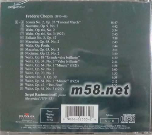RACHMANINOFF PALYS CHOPIN 拉赫曼尼諾夫演奏肖邦(GOLD SEAL系列)(m58.net) 謝爾蓋·瓦西里耶維奇·拉赫瑪尼諾夫 Sergey Rakhmaninov 1873.4.1-1943.3.28 俄國作曲家、鋼琴家、指揮家。生于俄國諾夫戈羅省奧涅格。父為地主,家庭富有。4歲從母學習鋼琴,9歲進圣彼得堡音樂學院學習鋼琴,12歲轉入莫斯科音樂學院繼續學習鋼琴和作曲。畢業后從事演奏、指揮和作曲。1904年起,任莫斯科大劇院指揮。1906年僑居德國,此時進入創作高峰期。1917年俄國革命后,拉赫瑪尼諾夫流亡瑞士,1918年赴美演出,定居美國后,創作上充滿了不協和與悲劇性,成為二十世紀上半葉重要的鋼琴演奏家。二次大戰期間(1939-1945)多次舉辦音樂會,將收入捐給蘇聯國防基金會。 拉赫瑪尼諾夫的音樂創作屬晚期浪漫主義的音樂觀和風格,與柴科夫斯基的音樂有較密切的聯系。他的作品,曲調氣息寬廣、舒展優美、憂郁深沉,具有鮮明的俄羅斯民族風格和民間風俗的刻畫,擅長史詩式壯闊的音樂風格。他的鋼琴作品,技巧高超、氣勢宏大、音響濃郁厚實、力度對比強烈。作為指揮家,詮釋格林卡、柴科夫斯基、格里格等作曲家的作品極具特色。