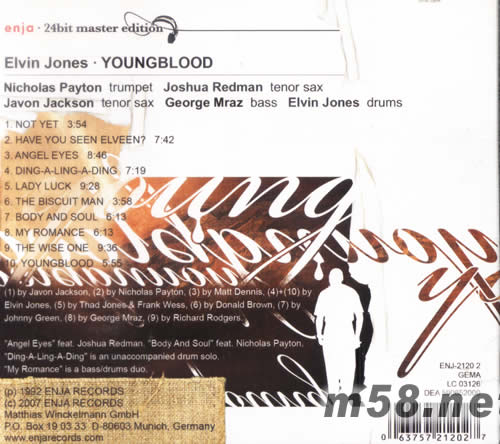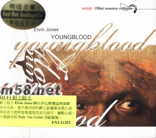 HIFI爵士鼓王 YOUNGBLOOD(m58.net) 爵士鼓ELVIN JONES多拍多位樂壇將演繹多首名曲,當中第四首的爵士鼓獨奏曲及第九首與低音大提琴協奏盡現其非凡技巧,激動心弦.天碟錄音師RUDY VAN GELDER 頂級錄制.