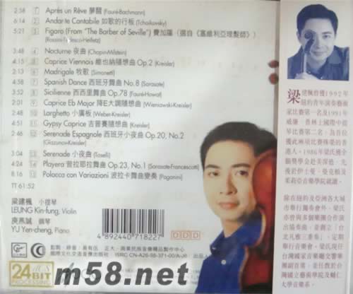 [1] 夢醒 (Faure-Bachmann) 2:58 [2] 如歌的行板 (Tchaikovsky) 6:14 [3] 費加羅 選自 <<塞維利亞理發師>> (Rossini-Tedesco-Heifetz) 5:21 [4] 夜曲 (Chopin-Milstein) 3:48 [5] 維也納隨想曲 (Kreisler) 4:15 [6] 牧歌 (Simonetti) 2:13 [7] 西班牙舞曲 (Sarasate) 4:58 [8] 西西里舞曲 (Faure-Howat) 3:52 [9] 降E大調隨想曲 (Wieniawski-Kreisler) 2:01 [10] 小廣板 (Weber-Kreisler) 2:48 [11] 吉卜賽隨想曲 (Kreisler) 4:51 [12] 西班牙小夜曲 (Glazunov-Kreisler) 2:46 [13] 小夜曲 (Toselli) 3:04 [14] 普拉耶拉舞曲 (Sarasate-Francescatti) 4:24 [15] 波拉卡舞曲變奏 (Paganini)