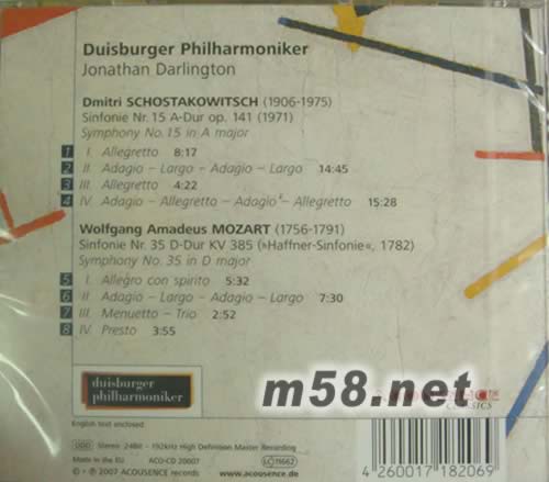 SHOSTAKOVICH: SYM. NO. 15 IN A MAJOR OP. 141(m58.net) 2004年成立,德國(guó)迅速走紅,錄音理念以發(fā)燒音效配上感動(dòng)聽眾之樂章為主。當(dāng)中LIVING CONCERT SERIES (現(xiàn)場(chǎng)一樣系列)是其最出眾作品系列,帶出現(xiàn)場(chǎng)感,重播現(xiàn)場(chǎng)原音為目標(biāo)。Jonathan Darlington (喬納森。達(dá)林頓) 指揮Duisburger Philharmoniker (德國(guó)杜伊斯堡愛樂樂團(tuán))精彩演出。