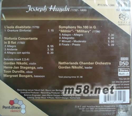 海頓:第100號交響曲“軍隊”&交響協奏曲 SACE(m58.net) 海頓:第100號交響曲“軍隊”&交響協奏曲》海頓的“軍隊”交響曲的標題來自第二樂章的有軍隊風格的進行曲式,由海頓自己命名,也是海頓交響樂中的顛峰作品!對音響效果要求極高!尼科萊茲帶領荷蘭室內管弦樂團演奏。SA-CD制作DSD母版最新推薦!