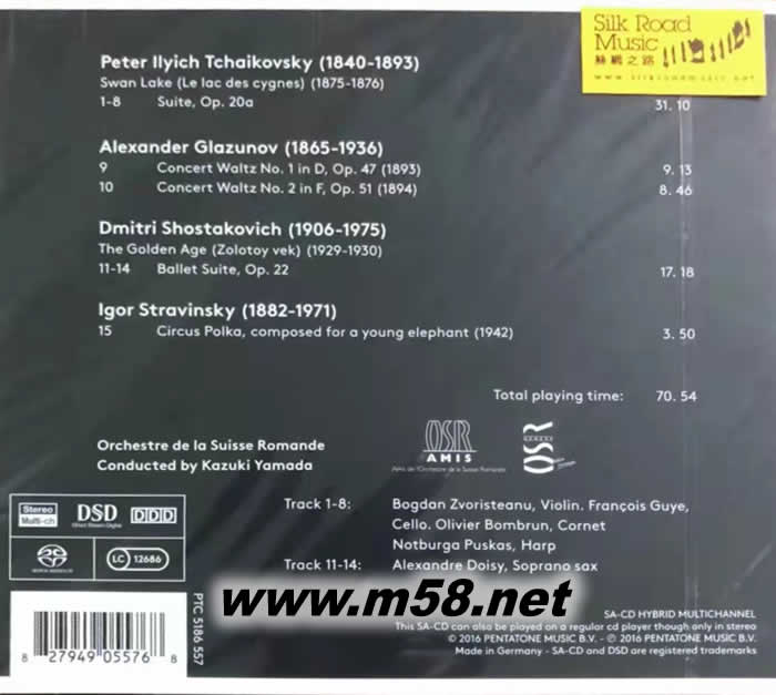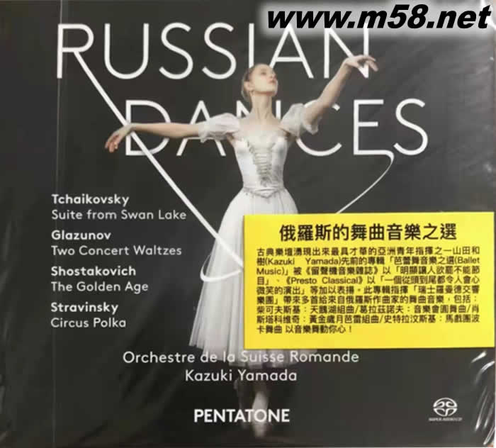 "第51屆國際青年指揮大賽(International Competition for Young Conductors)"首獎得主山田和樹 (Kazuki Yamada)是現今”日本愛樂樂團(Japan Philharmonic)”的首席指揮和”瑞士羅曼德交響樂團(Orchestre de la Suisse Romande)”的首席客席指揮,現時年僅36歲的他是近年來在歐洲古典樂壇涌現出來最具才華的亞洲青年指揮之一。於2015年4月,山田和樹被摩納哥漢諾威公主任命接任杰梅蒂(Gianluigi Gelmetti)為繼任樂團的藝術與音樂總監,任期由2016年9月開始。 此專輯由山田和樹指揮”瑞士羅曼德交響樂團”帶來多首給來自俄羅斯作曲家的舞曲之選,包括: 柴可夫斯基:天鵝湖組曲,作品20(Tchaikovsky:Swan Lake, Op. 20 Suite) 葛拉茲諾夫:音樂會圓舞曲(Glazunov:Concert Waltzes Nos. 1 & 2) 肖斯塔科維奇:黃金歲月芭雷組曲,作品22a(Shostakovich:The Golden Age, Suite from the Ballet, Op. 22a) 史特拉汶斯基:馬戲團波卡舞曲(Stravinsky:Circus Polka) 山田和樹先前的專輯<(芭蕾舞音樂之選(Ballet Music)>被<留聲機音樂雜誌(Gramophone)>以「明顯讓人欲罷不能節目」、以「一個從頭到尾都令人會心微笑的演出」等加以表揚,充滿動感的演繹,配合最傳真、專業的DSD發燒錄音制式製作,國際音樂媒體一致好評,以音樂舞動你心。