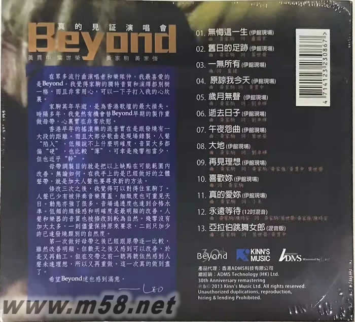 ADMS 特別輯錄”Beyond 89年香港真的見證演唱會”11首當時最熱斗歌曲,并加入從未出版的”永遠等待12”混合版”及”阿拉伯跳舞女郎混音版”, 并由Leo Fung重新作母盤調音, 以ADMS Alloy Gold 壓片, 是Beyond 歌迷不可或缺的珍藏品.