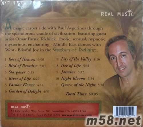 GARDEN OF DELIGHT 歡愉庭園(阿拉伯音樂) 新世紀純音樂(m58.net) 本專輯REAL唱片公司官方試聽網址:片段http://www.realmusic.com/shop/garden-of-delight/prod_114.html 全才音樂大師PAUL AVGERINOS以多種樂器,為你演奏11首極富中東亞拉伯色彩的音樂作品,更邀請大批樂壇猛將參與演出,歌曲充份滲透出濃厚的中東風味,發燒級錄音,精彩絕倫! 在《歡樂花園》(Garden Of Delight)里,種種的異國情調,感性、催眠、神秘,仿佛是花園里搖曳著令人神往的中東舞蹈。音樂中旋律優美妖艷,長笛和人聲吟唱相映成輝。