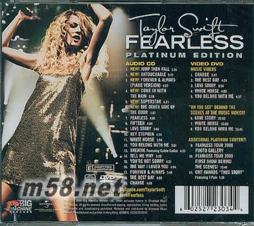 CD 01. Jump Then Fall 02. Untouchable 03. Forever & Always (Piano Version) 04. Come In With The Rain 05. SuperStar 06. The Other Side Of The Door 07. Fearless 08. Fifteen 09. Love Story 10. Hey Stephen 11. White Horse 12. You Belong With Me 13. Breathe 14. Tell Me Why 15. You're Not Sorry 16. The Way I Loved You 17. Forever & Always 18. The Best Day 19. Change DVD Music Video 01. Change 02. The Best Day 03. Love Story 04. White Horse 05. You Belong With Me Behind the Scenes 06. Love Story 07. White Horse 08. You Belong With Me 09. Fearless Tour 2009 Photo Gallery 10. Fearless Tour 2009 First Show Behind The Scenes! 11. CMT Awards "Thug Story" feat. T-Pain