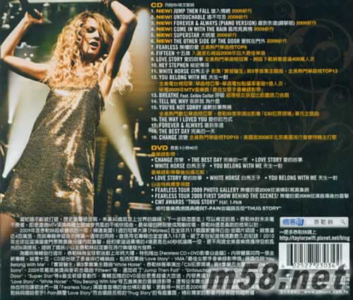 CD 01. Jump Then Fall 02. Untouchable 03. Forever & Always (Piano Version) 04. Come In With The Rain 05. SuperStar 06. The Other Side Of The Door 07. Fearless 08. Fifteen 09. Love Story 10. Hey Stephen 11. White Horse 12. You Belong With Me 13. Breathe 14. Tell Me Why 15. You're Not Sorry 16. The Way I Loved You 17. Forever & Always 18. The Best Day 19. Change DVD Music Video 01. Change 02. The Best Day 03. Love Story 04. White Horse 05. You Belong With Me Behind the Scenes 06. Love Story 07. White Horse 08. You Belong With Me 09. Fearless Tour 2009 Photo Gallery 10. Fearless Tour 2009 First Show Behind The Scenes! 11. CMT Awards "Thug Story" feat. T-Pain