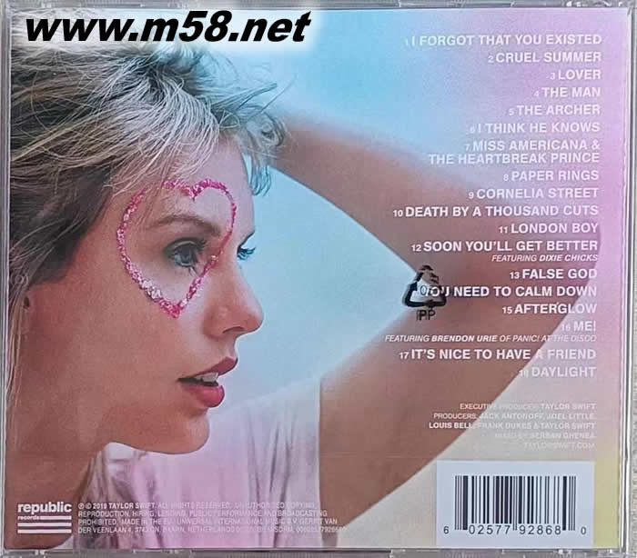 1. I Forgot That You Existed 忘記你的存在 2. Cruel Summer 慘痛夏日 3. Lover 情人 登上全臺iTunes冠軍創(chuàng)作曲 4. The Man 男人 5. The Archer 弓箭手 生涯第80首攻入告示牌熱門榜百大暖身曲 6. I Think He Knows 我想他懂我 7. Miss Americana & The Heartbreak Prince 美國小姐與心碎王子 8. Paper Rings 手作紙戒 9. Cornelia Street 科妮莉亞街 10. Death By A Thousand Cuts 凌虐到死 11. London Boy 倫敦男孩 12. Soon You’ll Get Better (feat. Dixie Chicks) 你很快就會好好的 與鄉(xiāng)村女子傳奇團體 狄克西女子合唱團合唱 13. False God 偽神 14. You Need To Calm Down 你需要冷靜一下 橫掃MTV音樂錄影帶大獎入圍「年度歌曲」、「夏日神曲」共9項 15. Afterglow 餘韻 16. ME! YouTube史上最快破億西洋MV 全球突破2億5千萬次串流收聽 17. It’s Nice To Have A Friend 有個好友真好 18. Daylight 曙光
