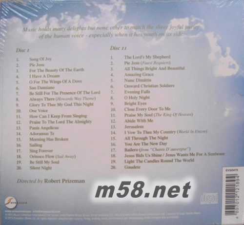 Angel voices 40首最精選(m58.net) 圣菲利浦男孩合唱團,是當前全球最著名的圣樂合唱團。他們來自南倫敦由一群平均年齡為7歲至14歲的倫敦男童所組成,他們至善至美的風格,受到全世界樂評的一致推崇,更受到全球愛樂者的喜愛,被樂迷們贊譽為「上帝賜與的盛禮」,其清晰諧和的歌聲,搭配著溫文儒雅的音樂,目前不僅每周日擁有自己的電視節目,並經常與國際巨星合唱,更有兩支打進排行榜的暢銷單曲,每一張專輯早已流傳全世界,成為市場上的暢銷發燒大碟,因為他們不僅對宗教詩歌拿手,連流行音樂也能充分份詮釋發揮,這張專輯,他們以更成熟的技巧與完美合聲,唱出二十首動人悅耳的名曲,或壯瀾宏偉,或溫馨喜樂,或優雅圣潔,每一首都令人百聽不厭,其中的好幾首歌曲,更為各國爭相用為著名的廣告曲,是新世紀最值得用心聽的聲音。