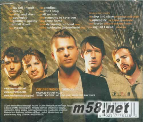 01. Say (All I Need) 02. Mercy 03. Stop and Stare 04. Apologize 05. Goodbye, Apathy 06. All Fall Down 07. Tyrant 08. Prodigal 09. Won't Stop 10. All We Are 11. Someone to Save You 12. Come Home 13. Dreaming Out Loud (Bonus) 14. Apologize (Timbaland Remix) Bonus Live Tracks: 01. Stop and Stare 02. Apologize 03. Mercy 04. Say (All I Need)
