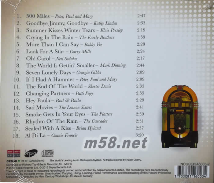 VOL.1 1. 500 Miles Peter, Paul and Mary 2. Goodbye Jimmy, Goodbye Kathy Linden with Joe Leanhy’s Orchestra 3. Summer Kisses Winter Tears Elvis Presley with Lionel Newman as Musical Conductor 4. Crying In The Rain The Everly Brothers 5. More Than I Can Say Bobby Vee 6. Look For A Star Garry Mills with Orchestra conducted by Johnny Douglas 7. Oh! Carol Neil Sedaka 8. The World Is Gettin’ Smaller Mark Dinning 9. Seven Lonely Days Georgia Gibbs and The Yale Brothers with Orchestra conducted by Glenn Osser 10. If I Had A Hammer Peter, Paul and Mary 11. The End Of The World Skeeter Davis 12. Changing Partners Patti Page with Orchestra conducted by Joe Reisman 13. Hey Paula Paul & Paula 14. Sad Movies The Lennon Sisters, Arranged and Conducted by Billy Vaughn 15. Smoke Gets In Your Eyes The Platters 16. Rhythm Of The Rain The Cascades 17. Sealed With A Kiss Brian Hyland 18. Al Di La Connie Francis, Arranged and Orchestra conducted by Giulio Libano